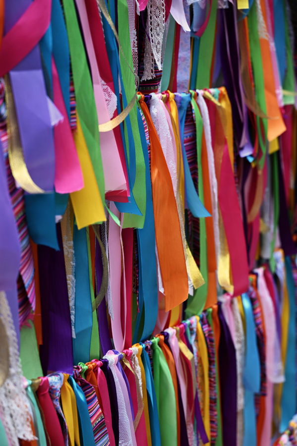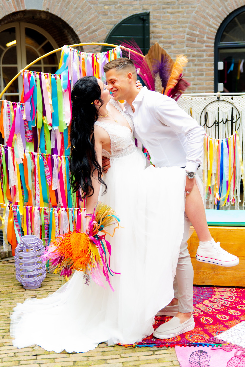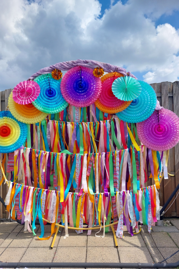 Te gekke ronde backdrop met een doorsnede van 2.00 meter, vol met linten slingers.