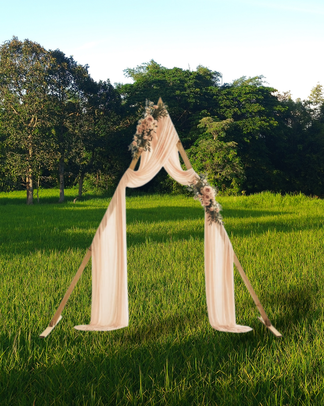 Deze lichthouten driehoek backdrop is perfect voor buiten bruiloften. Met een afmeting van 202 x 95 x 254 is deze goed te combineren met doeken of bloemstukken. Er worden standaard 2 doeken bijgeleverd in een kleur naar keuze. Meerdere doeken kunnen los bijbesteld worden.