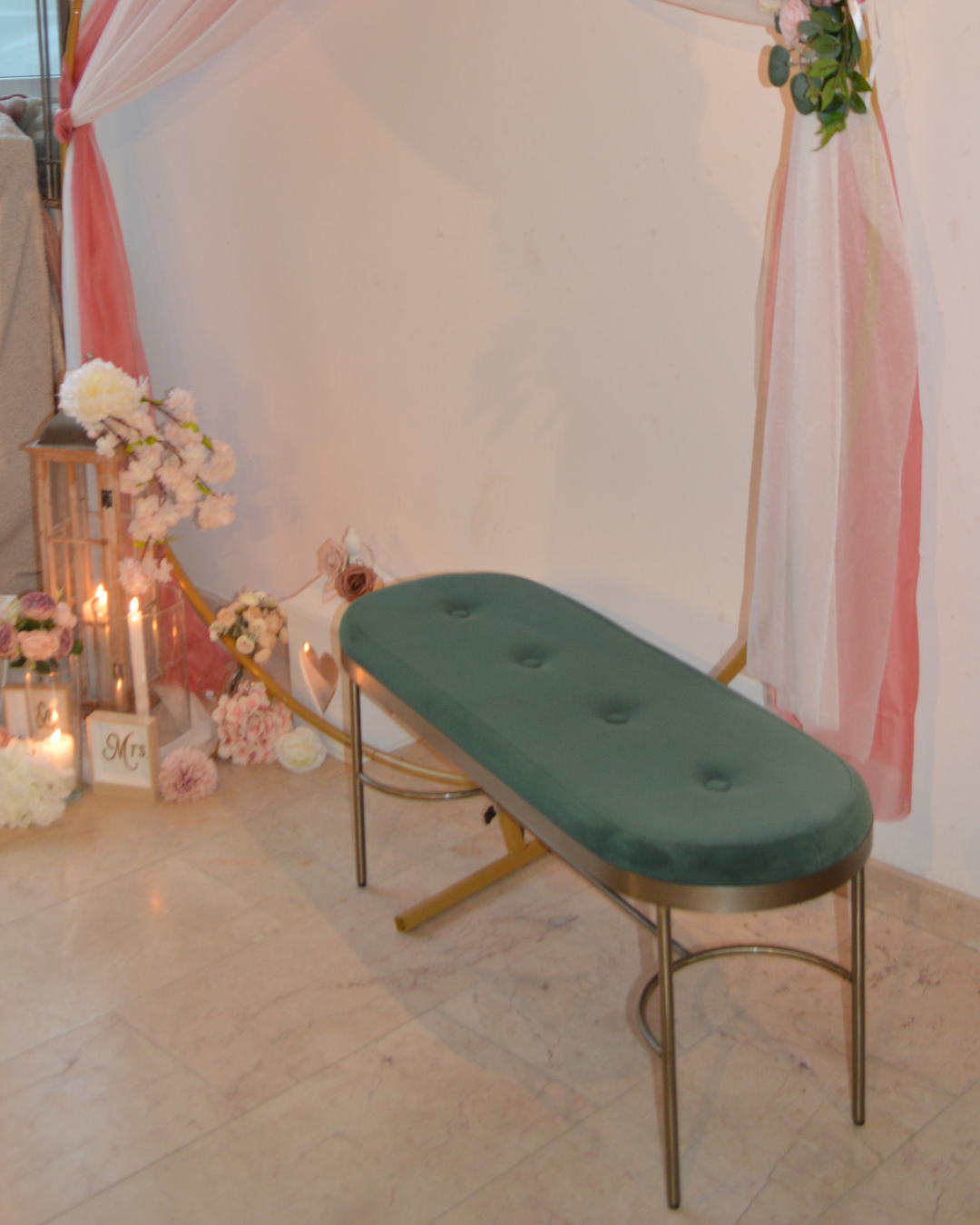 Dit mooie bankje heeft dankzij de velvet stof en gouden poten al snel een luxe uitstraling. Perfect voor een bruidspaar of als extra bankje voor bijvoorbeeld kinderen of getuigen.