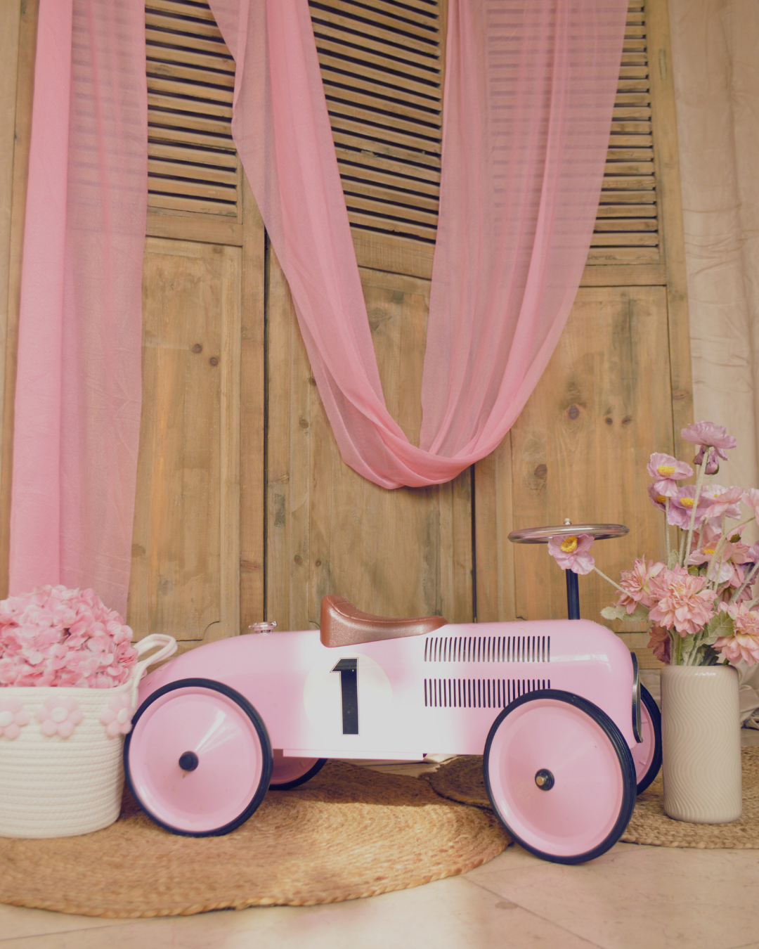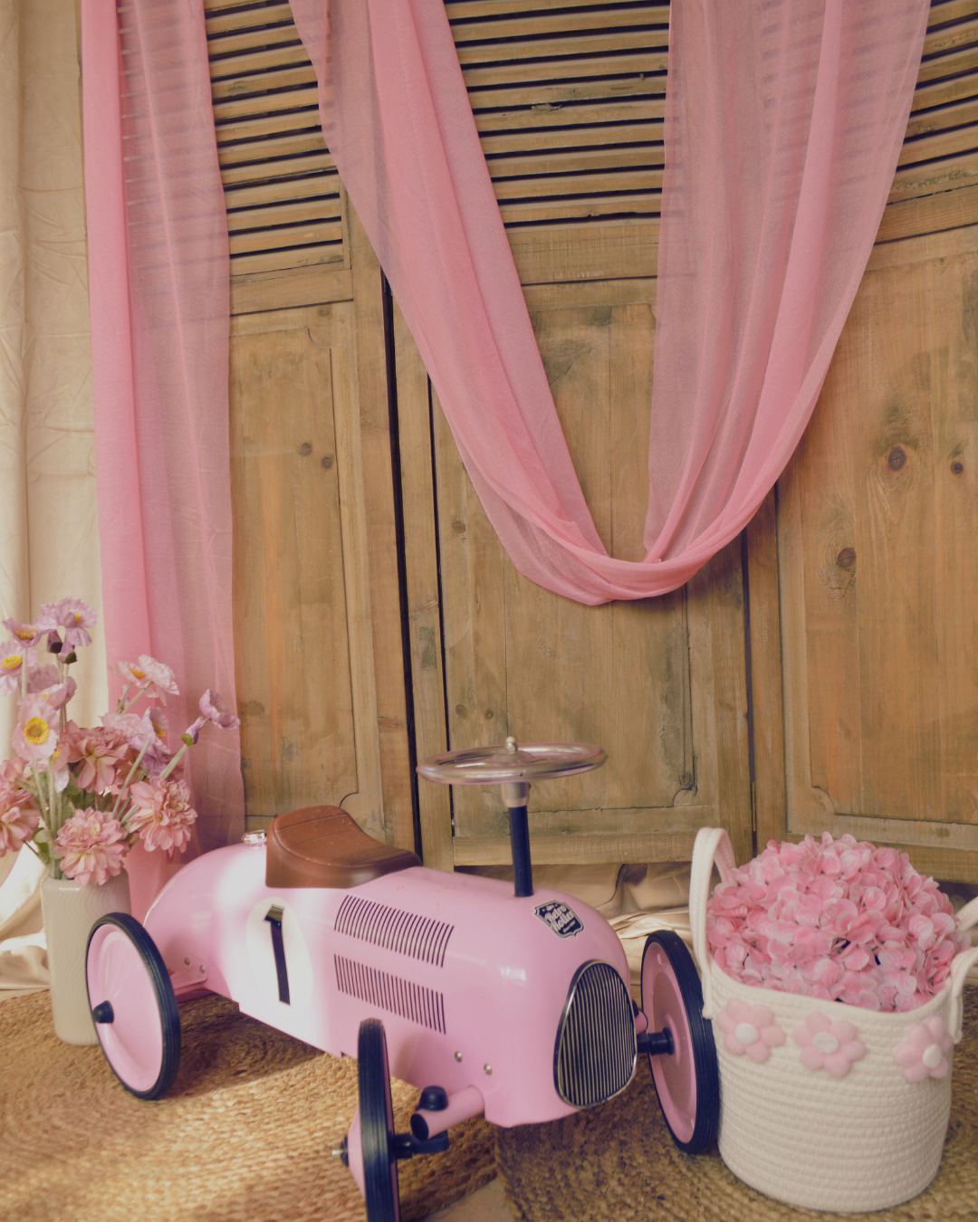 Deze geweldige roze loopauto kan voor verschillende doeleinden gebruikt worden; Voor een klein meisje bij een bruiloft ceremonie, tijdens een babyshower als decor of als onderdeel van een fotosetting.